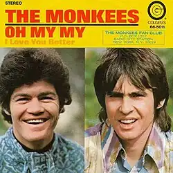 "Oh My My" is a song by the Monkees, released on April 1, 1970 on Colgems single #5011. It was the final single released during their original 1966โ€“70 run. The song was written by Jeff Barry and Andy Kim.[1] "Oh My My" was recorded February 5, 1970, and made it to No. 98 on the Billboard Hot 100 chart. [2] The single was their last entry, on the charts, until 1986. The B-side was "I Love You Better", also written by Barry and Kim.