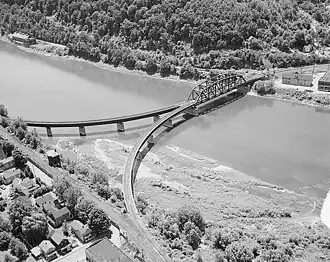 The current bridge is the fourth structure at the current location. The Allegheny Valley Railroad reached Venango City, across the Allegheny from Oil City, on January 8, 1868.[1][2] It completed a new bridge over the river on February 2, 1870.[3] The railroad replaced the bridge with a new 678-foot (207 m) wooden Howe truss bridge in 1880.[1] The Allegheny Valley Railway, successor to the Allegheny Valley Railroad, replaced this bridge in 1895 with a steel bridge.[4]
