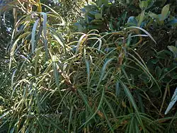 Olearia lacunosa can grow up to 5 metres high and has long narrow leaves that are dark green above and brown underneath.[3]