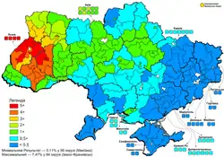 During the 2010 Ukrainian local elections Tyahnybok's party won between twenty and thirty percent of the votes in Eastern Galicia where it became one of the main forces in local government.[7][22]