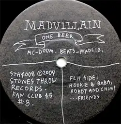 "One Beer" is a song recorded by American hip hop duo Madvillain, originally intended for inclusion on their debut studio album Madvillainy.[1] The song instead ended up being used on MF DOOM's 2004 album Mm..Food, credited to MF DOOM instead of Madvillain.[2] "One Beer" was released as a limited-press 7" single in 2004, given away by select online retailers with copies of Madvillainy.[3] An animated music video was released on 16 November 2018, 14 years after Mm..Food's release.[4]