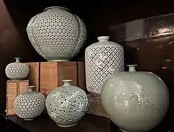 The terms double-openwork and triple-openwork, also called reticulated, are typically associated with ceramic pieces that are created with two or three walls. Korean ceramist Kim Se-yong produces openwork pieces.[9]