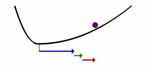 An electron (purple) is being pushed side-to-side by a sinusoidally-oscillating force, i.e. the light's electric field. But because the electron is in an anharmonic potential (black curve), the electron motion is not sinusoidal. The three arrows show the Fourier series of the motion: The blue arrow corresponds to ordinary (linear) susceptibility, the green arrow corresponds to second-harmonic generation, and the red arrow corresponds to optical rectification. (When there is no oscillating force, the electron sits at the potential minimum, but when there is an oscillating force, it is, on average, further to the right, by an amount shown by the red arrow.)