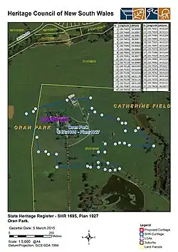 1. ^ a b c d e f g h i j k l m n o p q r s t u v w x y z aa ab ac ad ae af ag ah ai aj ak al am an ao ap aq ar as at au av aw ax ay "Oran Park". New South Wales State Heritage Register. Department of Planning & Environment. H01695. Retrieved 2 June 2018. Text is licensed by State of New South Wales (Department of Planning and Environment) under CC BY 4.0 licence.