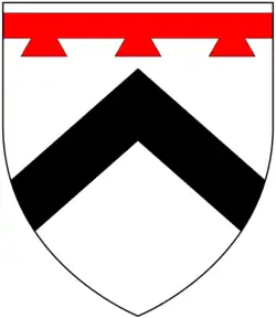 Arms of Prideaux: Argent, a chevron sable in chief a label of three points gules