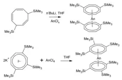 - ^ a b Rausch J, Apostolidis C, Walter O, Lorenz V, Hrib CG, Hilfert L, Kühling M, Busse S, Edelmann FT (2015). "One ligand fits all: lanthanide and actinide sandwich complexes comprising the 1, 4-bis (trimethylsilyl) cyclooctatetraenyl (= COT′′) ligand". New Journal of Chemistry. 39 (10): 7656–66. doi:10.1039/c5nj00991j.