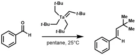Tantalum alkylidene complexes are nucleophilic.[1] They effect a number of reactions including: olefinations, olefin metathesis, hydroaminoalkylation of olefins, and conjugate allylation of enones.