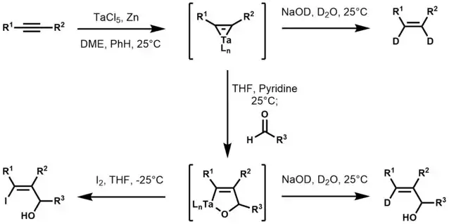 - ^ Takai, Kazuhiko; Kataoka, Y.; Utimoto, K. (1990-03-01). "Tantalum-alkyne complexes as synthetic intermediates. Stereoselective preparation of trisubstituted allylic alcohols from acetylenes and aldehydes". The Journal of Organic Chemistry. 55 (6): 1707–1708. doi:10.1021/jo00293a008. ISSN 0022-3263.