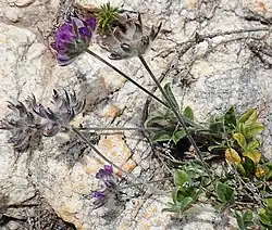 The flowers grow in roundish heads of 6-15 together on peduncles of 5–20 cm (2.0–7.9 in) long that emerge from the axils of the leaves. Each head consist of 2-5 triplets of flowers, the lowest of which is subtended by a semi-circular, hairy bract that divides in 2 or 3 teeth. These bracts gradually get narrower for triplets implanted further to the tip of the petiole. Each individual flower sits on a pedicel of 1.5–2.0 mm (0.059–0.079 in) long and is subtended by a very narrow bract. The flowers are each 8–11 mm (0.31–0.43 in) long. The five hairy 11–13 mm (0.43–0.51 in) long sepals are merged into a calyx tube at the base of 2.5–3.0 mm (0.098–0.118 in) long, end in separate teeth, and enclose the petals in the bud. The lower tooth, subtending the keel, is 9–10 mm (0.35–0.39 in) long and 3.0–3.5 mm (0.12–0.14 in) wide and has prominent netted veins. The remaining four teeth are all curved, narrowly triangular in shape, 5.5–6.0 mm (0.22–0.24 in) long and 1.5–2.0 mm (0.059–0.079 in) wide. As in all Faboideae, the corolla is zygomorphic, forms a specialized structure and consists of 5 free petals. The corollas are initially mauve in colour but become purple with age. The upper petal, called the banner or standard, is large and envelops the other petals in the bud. It is slightly netted, teardrop-shaped, 8–10 mm (0.31–0.39 in) long and 5.0–6.5 mm (0.20–0.26 in) wide and narrows into a 3 mm (0.12 in) long claw at its base. The standard gradually curves back along its length. The two adjacent lateral petals that are called wings are 9.5–10.0 mm (0.37–0.39 in) long, with a blade of 6–7 mm (0.24–0.28 in) long and 2.2–2.5 mm (0.087–0.098 in) wide and have a sculpturing of 15-18 irregularly parallel ridges and an ear-shaped appendage reaching beyond the attachment to the claw. The wings are longer than and enclose the 2 bottom petals, which together are called the keel. The two keel petals have long claws and form a boat-like structure. The keel petals are also divided into a claw and a blade section, and the latter is 8 mm (0.31 in) long and 2 mm (0.079 in) wide, and has a rounded tip. The keel contains 10 filaments. The 9 filaments that are fused are 8 mm (0.31 in) long, while the one that is loosely attached for half of its length is 7.5 mm (0.30 in) long. The anthers are alternately fixed to their filament at the base and at midlength. The filaments envelop a swollen style of 8 mm (0.31 in) long, which contains at its base an ovary of 1.5 mm (0.059 in) long with some glands and curves about 2 mm (0.079 in) upwards before becoming the pin-shaped, papillose stigma.[1]