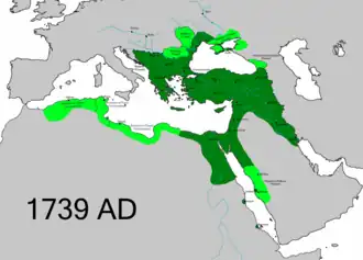 The Ottoman Empire[l] (/ˈɒtəmən/ ⓘ), also called the Turkish Empire,[24][25] was an imperial realm[m] that controlled much of Southeast Europe, West Asia, and North Africa from the 14th to early 20th centuries; it also controlled parts of southeastern Central Europe, between the early 16th and early 18th centuries.[26][27][28]