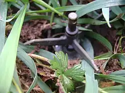 A PROM-1 which has been buried so that only the prongs of the fuze are visible. A tripwire could be connected to the central prong (which has a hole in it) to increase the activation area