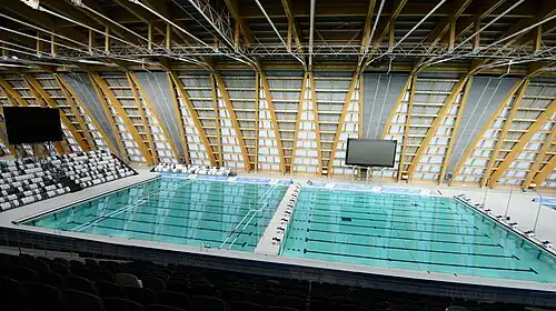 The temporary open arena for water polo with a spectator capacity of 3,500 was built nearby, using its service and support systems.
