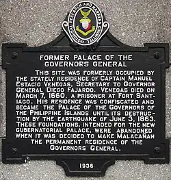 - ^ Former Palace of the Governors General [sic] (Marker on building facade). Palacio del Gobernador in Intramuros: Historical Research and Markers Committee. 1936.