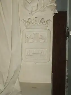 - ^ From a photograph of the principle (front) facade. The inscription is located over the arch of the portico door under the pediment. The inscription is neo-Latin, all upper case with periods denoting spaces between words. It is a passage from the Liber Ecclesiasticus, Chapter 44.7, of the Vulgate, the standard Catholic Bible. Though made a part of the Catholic Canon (Bible) in 1546, and accepted as true Bible by the eastern churches, it is rejected as Scripture by the Jews, the Lutherans, and the Anglicans.