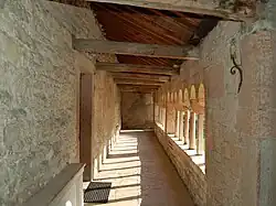 One of the closed sides of the cloister, featuring wooden chains and roofing