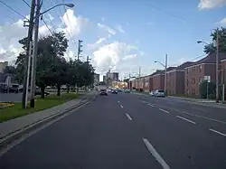 Queens Quay begins west of Bathurst Street at Stadium Road and ends at Lake Shore Boulevard East, where it continues north as Parliament Street.[3] The roadbed is built entirely on infill and is the closest road to Lake Ontario throughout the downtown core. Though once abutted by industrial and transportation uses from end to end, much of its length is now lined with recreational and residential uses. The 509 Harbourfront streetcar line now travels in a dedicated streetcar right-of-way in the median from Bay Street to Bathurst Street. The length east of Yonge Street retains some industrial uses, although this is changing with the development of residential and commercial uses.