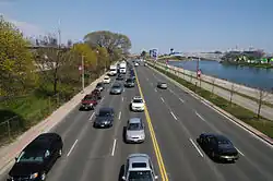 Eastern Avenue, formerly South Park Street, was named on November 27, 1876.[9] It was connected with Kingston Road in 1998 following the removal of the old Woodbine Racetrack.[10] Eastern Avenue begins at a curve along Front Street east of Parliament Street; eastbound traffic on Front is defaulted onto Eastern Avenue, vice versa for westbound traffic on Eastern. The road crosses the Don River, merging with Richmond Street and Adelaide Street and providing access to the Don Valley Parkway. East of Broadview Avenue, it travels parallel to and three blocks south of Queen Street East along the King Street alignment to east of Coxwell Avenue, where it curves northward and meets Queen Street. North of Queen Street, the road becomes Kingston Road.[3]