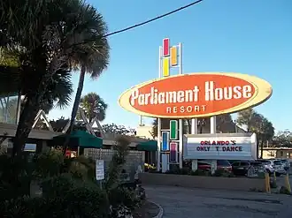 Parliament House was a gay resort on the Orange Blossom Trail in Orlando, Florida, United States, that included several bars and hosted performances such as drag shows.[1] There were 112 rooms in the complex, which encompassed 10,000 square feet, including an outdoor stage, a swimming pool, and a dance floor.[2] The resort was established in 1975,[3] and eventually became the best-known gay resort in Orlando.[4] In 2006, the resort expanded to include a timeshare.[5] In 2010, Parliament House was in danger of foreclosure.[6] In 2012, Kenneth Creuzer, a 48-year-old HIV-positive man, was arrested on charges relating to his having allegedly raped a man at Parliament House.[7] Alison Arngrim, who portrayed Nellie Oleson on the television series Little House on the Prairie, performed a one-person show called "Confessions of a Prairie Bitch" at Parliament House in 2013.[8] On July 25, 2014, the resort filed for Chapter 11 bankruptcy, with $12.4 million in debts and nearly $4 million in assets.[9] In February 2015, a fourteen-million-dollar debt relief plan was approved by the relevant parties.[10] In 2019, NewNowNext declared Parliament House the most popular gay bar in the United States.[11]