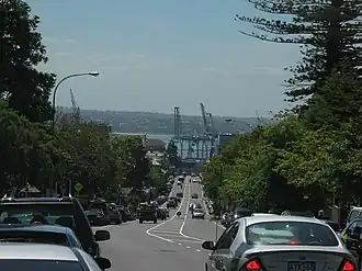 Looking north-north-west down Parnell Road, Ports of Auckland and Waitematā Harbour visible in the distance