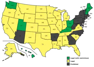 Payday lending is legal in 27 states, with 9 others allowing some form of short term storefront lending with restrictions. The remaining 14 and the District of Columbia forbid the practice.[16] Some states have aggressively pursued lenders they felt violate their state laws.[17][18]