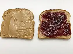 Peanut butter and jelly sandwiches (PB&J) consist of a layer of peanut butter and a layer of jelly or jam spread across sandwich bread. They are typically associated with grape jelly and white bread.[1][2] Peanut butter and jelly sandwiches contain significant starch,[3] protein, fat, and sugar content. While the fat and sugar content were considered beneficial when the sandwich was created,[4] they came to be seen as undesirable toward the end of the 20th century.[5] Critics of processed food point to the white bread, hydrogenated peanut butter, and corn syrup jelly that are commonly used to make the sandwich.[6]