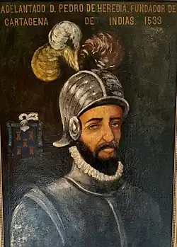 Heredia traveled to the West Indies with his brother Alonso de Heredia and settled in Santo Domingo, the capital of the island of Hispaniola, where they eventually inherited a sugar mill and an estate in Azua Province.[3] Then came news of the death of the governor of Santa Marta, Rodrigo de Bastidas, and the Royal Audiencia of Santo Domingo decided to send Pedro de Vadillo as interim governor of the province and Pedro de Heredia as his lieutenant.[4] In 1528, Vadillo and Heredia landed in Santa Marta with 200 men and soon became involved in disputes with Rodrigo Alvarez Palomino, a former lieutenant of Bastidas, which were resolved when the latter was drowned in the river that bears his name.