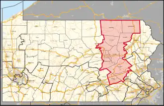 Pennsylvania's 9th congressional district is located in the east central part of the state and encompasses all of Bradford, Columbia, Lebanon, Montour, Northumberland, Schuylkill, Sullivan, Susquehanna, and Wyoming counties, as well as parts of Berks, Luzerne, and Lycoming counties.