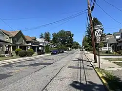 Past this interchange, the route continues north-northwest along South Queen Street through more commercial areas. PA 74 turns to the west and becomes three lanes with a center left-turn lane, passing to the south of the WPMT television studios. The road enters Spring Garden Township and runs past a mix of residences and commercial establishments, curving to the northwest. The route enters the city of York and narrows to two lanes, passing through dense residential areas. The road bends to the north and becomes lined with rowhouses and scattered businesses, crossing College Avenue. Farther north, the route reaches PA 462, which is routed along the one-way pair of East Market Street eastbound and East Philadelphia Street westbound. At this point, PA 74 turns west to join PA 462 along the one-way pair, with the northbound direction following westbound PA 462 along East Philadelphia Street and the southbound direction following eastbound PA 462 along East Market Street. Both streets carry two lanes of one-way traffic. The two routes head west into the commercial downtown of York. PA 74/PA 462 intersects I-83 Bus. (George Street) at Continental Square southbound and near the York County Courthouse northbound. Past this intersection, the one-way pair becomes West Philadelphia Street northbound and West Market Street southbound. The routes intersect a York Railway line at Pershing Avenue, where West Market Street becoming three lanes wide with two eastbound lanes carrying PA 74 southbound/PA 462 eastbound and one westbound lane. Following this, PA 74/PA 462 cross the York County Heritage Rail Trail and the Codorus Creek, leaving the downtown area of York. The one-way pair continues through urban residential areas of rowhouses with a few businesses, with West Market Street becoming two-way and two lanes wide. PA 74 splits from PA 462 by heading northwest on two-lane undivided Carlisle Avenue. The route crosses a York Railway line and heads through residential areas before it becomes the border between York to the north and West Manchester Township to the south, passing to the north of the York Fairgrounds.[2][3]