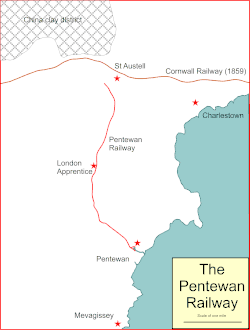 In 1833 a coal yard and siding were built at London Apprentice to serve the tin mine at Polgooth. In time the line serviced a number of small mica works and other industries along the line, including the St Austell gas works, for which it provided coal. Coal was also brought in to the mica kilns, as well as to St Austell. Baltic timber was also taken from Pentewan to St Austell for making barrels.[4]