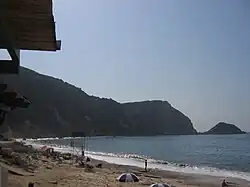 The beach is set at the base of a very steep road, surrounded by mountains, in a curved bay with a strip of pebble and sand beach which is up to 50M wide in places. The beach is about 600M long, with the central part being used by swimmers.