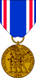 The Philippine Congressional Medal is 1 1/4 inches in diameter made of bronze with an oxidized and relieved finish. The obverse of the medal depicts a color guard of one flag bearer accompanied by two soldiers bearing rifles, marching toward the left of the medal. Around the edge of the medal are the words PHILIPPINE INSURRECTION. In the exergue is the date 1899. The reverse bears the inscription FOR PATRIOTISM FORTITUDE AND LOYALTY surrounded by a wreath of pine branches on the left and palms on the right, tied at the bottom with a bow. The suspension and service ribbons are ultramarine blue with edge stripes of red and white. The outside white stripes are 1/16 of an inch from the edge and 1/16 inches wide. The inside stripes of old glory red and white are 1/8 inches wide.[1]