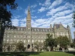Since 1881, with the construction of Healy Hall by Paul J. Pelz under the direction of University president Patrick Healy two years prior, the Philodemic has been headquartered in a debating hall on the second floor of Healy, specially designed for the Philodemic. The Philodemic Room is directly adjacent to the president's office and includes a president's chair designed by Pelz himself.[12] In the 1990s, the Philodemic was not permitted to access the room for a number of years, with the room being utilized as a conference room. During this time period, debates were held in other campus venues, and even once in the hallway outside the Philodemic Room. The Society also holds certain special debates, such as the annual humorous Christmas debate, in historic Riggs Library, also in Healy Hall.
