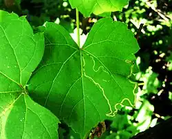 Leafmine in frost grape (Vitis vulpina) caused by Phyllocnistis vitifoliella