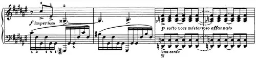 96–119 | The transition begins at m. 96, and consists of three 2-bar motifs. It gradually moves from the initial C♯ major tonality to the Bb major tonality of the second theme. The first motif is marked imperioso . The second is marked sotto voce misterioso affanato. These two motifs are presented alternatively three times, then, the second is prolonged and bursts in a third 2-bar motif marked quasi trombe-imperioso. A dominant ninth chord prepares the entrance of the second theme. | |