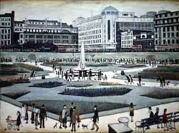 The commemorative fountain depicted at the centre of the gardens was new at the time of Lowry's painting; it had replaced an earlier public sculpture entitled Adrift by John Cassidy, which was relocated to the south end of the gardens in 1953. In 2001-2003, Piccadilly Gardens were re-landscaped by Manchester City Council and the sunken garden seen in the painting was filled in.[10][11] The Coronation Fountain has been relocated to Platt Fields Park in the southern suburb of Fallowfield, and Cassidy's sculpture is now situated in St Peter's Square. [4][5] Following the 21st-century remodelling, Lowry's painting is noted as a historical record of the former layout of Piccadilly Gardens.[12]