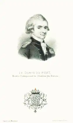 Count Pierre-Louis-George du Buat (23 April 1734 – 17 October 1809) was a French military engineer who worked on problems in hydraulics and hydrodynamics. He examined the flow of water and came up with a mathematical formulation defining the rate of flow of water through pipes which he published in Principes d’hydraulique, vérifiés par un grand nombre d’expériences faites par ordre du gouvernement.