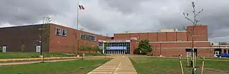 Land for a new, larger building was purchased from the University of Michigan in 1950. The new site, on West Stadium Blvd west of South Main Street, is directly southwest of the University of Michigan Football Stadium and had been used for game day parking, a tradition that continues under school district ownership. Construction of the new Ann Arbor High School building started in 1953 and was completed in time for all classes to move the new location for the fall of 1956.[5][7] By the 1960s, the new building had already reached capacity, and thus the school board established Huron High School on the city's east side as the city's second comprehensive high school. The old school was renamed to Pioneer High School starting in 1968.[8] Huron began operating as a separate school during the 1968–69 school year, before Huron's building was completed, so students from the old and new schools shared the Pioneer building that year on a split schedule with Pioneer students attending classes in the morning and Huron students in the afternoon.