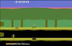 The chip allowed the game to play music that included a melody track, a harmony track, a base track and percussion. This made the game the first Atari 2600 game with a full scored polyphonic musical track.[11] The score features a four-part musical score composed by Crane. It features a central "heroic" theme that plays before becoming a loop of more atmospheric music. The main theme in the game plays the bass through one channel, two channels play the melody and harmony while the last channel plays percussion sounds. The song "Sobre las olas" plays when Harry ascends using a balloon.[13]