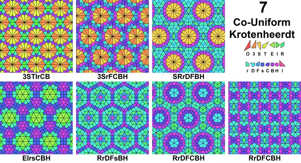 Finally, if the number of types of planigons is the same as the uniformity (m = k below), then the tiling is said to be dual Krotenheerdt. In general, the uniformity is greater than or equal to the number of types of vertices (m ≥ k), as different types of planigons necessarily have different orbits, but not vice versa. Setting m = n = k, there are 11 such dual tilings for n = 1; 20 such dual tilings for n = 2; 39 such dual tilings for n = 3; 33 such dual tilings for n = 4; 15 such dual tilings for n = 5; 10 such dual tilings for n = 6; and 7 such dual tilings for n = 7.