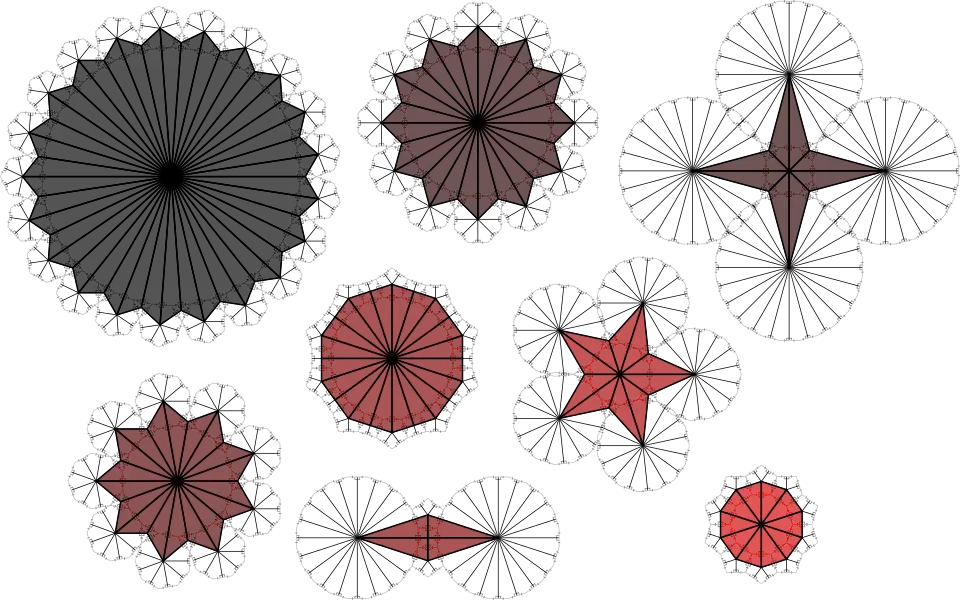 In fact, any group of planigons can be constructed from the edges of a polygram, where and is the number of sides of sides in the RP adjacent to each involved vertex figure. This is because the circumradius of any regular -gon (from the vertex to the centroid) is the same as the distance from the center of the polygram to its line segments which intersect at the angle , since all polygrams admit incircles of inradii tangent to all its sides.
