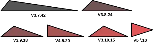 These tilings are listed by their face configuration, the number of faces at each vertex of a face. For example V4.8.8 (or V4.82) means isosceles triangle tiles with one corner with four triangles, and two corners containing eight triangles.