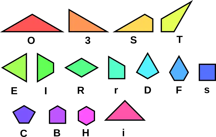 The Laves tilings have vertices at the centers of the regular polygons, and edges connecting centers of regular polygons that share an edge. The tiles of the Laves tilings are called planigons. This includes the 3 regular tiles (triangle, square and hexagon) and 8 irregular ones.[4] Each vertex has edges evenly spaced around it. Three dimensional analogues of the planigons are called stereohedrons.