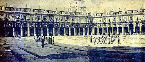 In the early morning of September 7, 1872 a fire destroyed the previous mercado de Tacón and it was necessary to install a provisional market in the Campo de Marte. The Public Works Advisory Board met on April 29, 1874, and the decision was made to replace the old market in the same place with the name Plaza de Tacón. The fruit stalls, the little shops, the clothing stores, the fur shops and a thousand other establishments that adorned the street gave each side of the building its particular character.[7] With some exceptions, the shopkeepers invented new ways to attract customers, otherwise nothing remarkable happened in the Plaza de Vapor during the working hours; as the night fell, one found the animation of the city, the electric lights, the silence on the interior courtyard and the darkness.[8]