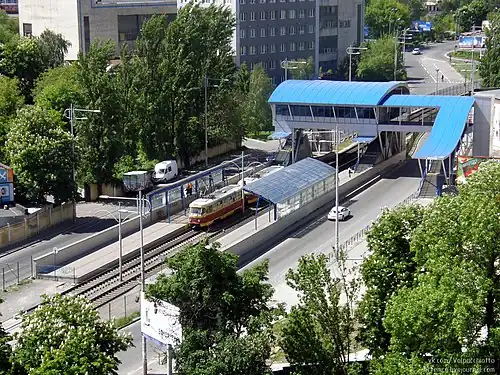 Ploshcha Halytska (Ukrainian: Площа Галицька; until 2023, Ploshcha Peremohy) is a station on the Kyiv Light Rail. Originally opened in 1978, during the reconstruction of the tramways in 2010 the station was moved to the middle Zhylianska Street and the previous track loops were removed.