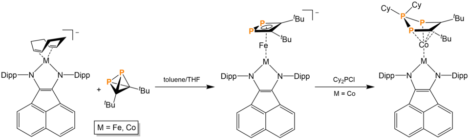 In solution with coordination complexes, tBu2C2P2 can cause ligand substitution. Most of these reactions cause cage-opening. The reaction of tBu2C2P2 with [K([18]crown-6)][Fe(anthracene)2] in toluene and THF causes the expulsion of one anthracene and the cage opening of tBu2C2P2 to form the replacement 1,2-diphosphacyclobutadiene ligand. This cage opening is due to P-C bond cleavage. Mono-ligand substitution is also observed in the reaction of tBu2C2P2 with [(DippBIAN)M(COD)] (Dipp = 2,6-diisopropylphenyl, BIAN = bis(arylimino)acenaphthene, M = Fe, Co). The cobalt product, upon reaction with Cy2PCl (Cy = cyclohexyl), forms a 1,2,3-triphospholium ligand. tBu2C2P2 can also displace the toluene in Ni(toluene)(IPr). Toluene is replaced by the aforementioned ladderane analogue in a η2-fashion.[15]