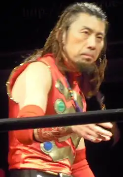 In 2002, after competing mostly in multi-man tag team matches, as well as some appearances in Fuyuki Army, World Entertainment Wrestling (WEW) and Japanese Women Pro-Wrestling Project (JWP), Sawada teamed with Hebikage in a losing effort against Mikami and Takashi Sasaki at NJPW's Battle Zone event at Nippon Budokan on June 7.[15] On June 29, he became the first male wrestler to challenge for the JWP Tag Team Championship alongside Kaori Yoneyama (then named Jaori Yoneyama for the occasion) in a mixed tag team match against Command Bolshoi and Gami, but they failed to capture the title.[16] Between July and August, Sawada teamed up with Super Uchuu Power in the 2002 KO-D Tag League, reaching the final but losing to the Suicideboyz and failing to capture the vacant KO-D Tag Team Championship.[17] The end of 2002 saw some infighting in the Jakai Tensho stable, sparked by a rebellion led by Toguro Habukage, which culminated at Never Mind 2002 at Korakuen Hall on December 22, where Sawada defeated Hebikage, then returned him and Habukage to their human form, while accepting punishment from his snake god by being turned to stone.[18][19]