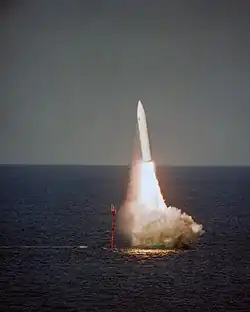 A turning point came during Project Nobska in the summer of 1956, when Edward Teller predicted that a 270-kilogram (600 lb) warhead would become available by 1963. This was much lighter than the 730-kilogram (1,600 lb) warhead of the Jupiter, and led the US Navy to pull out of the joint Jupiter project in late 1956 in order to concentrate on the development of a solid-fuel rocket, which became Polaris.[27] In May 1958, Burke arranged for the appointment of a Royal Navy liaison officer, Commander Michael Simeon, on the SPO staff.[28][29] In 1955, the SPO staff consisted of 45 officers and 45 civilians; by mid-1961, it had grown to 200 officers and 667 civilians. By then, over 11,000 contractors were involved, and it had a budget of $2 billion. SPO had to overcome formidable technological challenges;[30] but its success was also due to Burke's marketing of Polaris as a second strike weapon. In this role, its capabilities were highlighted and its limitations minimised.[31] The first Polaris boat, USS George Washington, fired a Polaris missile on 20 July 1960,[32] and commenced its initial operational patrol on 16 November 1960.[33]