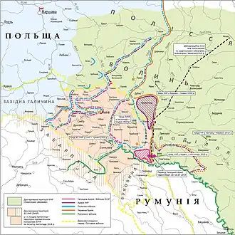 On May 14, 1919, a Polish general offensive began throughout Volhynia and Eastern Galicia. It was carried out by units of the Polish Army, aided by the newly arrived Blue Army of General Józef Haller de Hallenburg. This army, composed of Polish forces which had fought for the Entente on the Western front,[55] numbering 60,000 troops,[56] was well equipped by the Western Allies and partially staffed with experienced French officers specifically to fight the Bolsheviks and not the forces of the Western Ukrainian People's Republic. Despite this, the Poles dispatched Haller's army against the Ukrainians in order to break the stalemate in eastern Galicia. The Allies sent several telegrams ordering the Poles to halt their offensive, as using the French-equipped army against the Ukrainians specifically contradicted the conditions of the French assistance, but these were ignored,[57] with the Polish side arguing that the Ukrainians were Bolshevik sympathizers.[58] At the same time, on May 23, Romania opened a second front against Ukrainian forces, demanding their withdrawal from the southern sections of eastern Galicia, including the temporary capital of Stanislaviv. This resulted in a loss of territory, ammunition and further isolation from the outside world.[59]
