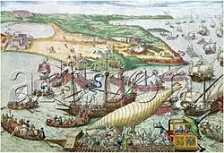 Besides São João Baptista itself, a further 20 war caravels and 2 carracks, bearing a total of 1,500 men (of which 515 were soldiers and 230 were artillery gunners) made up the Portuguese expedition. The entire fleet carried 598 guns in total, most of them small caliber (1 basilisco, 2 leões, 3 águias, 19 camelos, 21 esperas, 52 pedreiros, 150 falcões, 350 berços).[8] Its captain was António de Saldanha, with Infante Luís, Duke of Beja, brother of John III, and brother-in-law of Charles V being in overall command of the expeditionary corps, the galleon being his flagship.