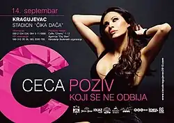 Poziv Tour was an eighth concert tour by Serbian singer Ceca, in support of her fifteenth studio album Poziv (2013). It began on 28 June 2013, in Belgrade, Serbia, at the Ušće and concluded on 7 May 2016, in Thessaloniki, Greece at the Fix live. During the tour she held the biggest concert of her career. The concert in Belgrade was attended by more than 150,000 people, and was one of the highest-attended concerts in the world.[1][2]